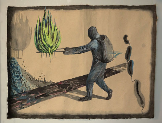 In this open studio, Nguyen Tran Nam, a Hanoi-based visual artist whose idiosyncratic oeuvre has been shaped by recurring themes of violence & power, death & immortality / incarnation, doubt & imagination, will extend his exploration into surrealism and speculative fiction. Titled ‘In spaces of everyscape, at time without end’, his fourth showcase at manzi and his first-ever body of painting using dzo paper as the main medium will present a catalogue of situations. Some of them are common and familiar in his art world, but the majority of other scenarios are quite new and uninvestigated. More than a reflection of his private memories and obsessions that haunted the artist himself, this series also depicts a shared curse put on his homeland and surrounding people, as indicated by the tactful allusions to some past sociopolitical episodes and the unrest of the current climate. That kind of subtlety and understatement in his paintings stimulates numerous possibilities for interpretation and fictionalization, with three innovative perspectives are suggested: