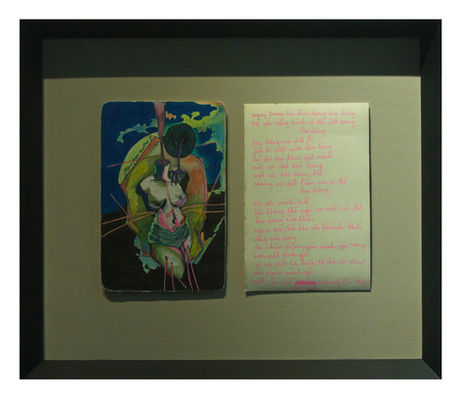 Perhaps it would be fitting to enter the ‘virtual private realm’ of this exhibition through the surreal, ghostly, and immaterial world of Lananh Le. To peer into the mind of this artist friend, whom we missed the chance to meet in real life, we can only rely on images scattered on the Internet or a few exchanges preserved by others from semi-intimate conversations with Lananh. But the most poignant pieces would be the memories retold by Lananh’s friends, those who have spent a part of their lives with her. Lananh usually inundates her ‘canvas’ with unexpected subconscious outbursts. Unpolished and without meticulous calculations of meaning or composition, the symbols in her works resemble oracles from a dream. Fantastic combination of irregular visual choices that constantly shift — objects of dense cultural meanings (chandelier, altar, temples, and bursts), animals that step out from the wilderness (tiger, zebra, lizard, varan, and snake), peculiar brush strokes (that depict faces—both familiar and strange, or a deity that manifests from squiggly lines on grid paper), the symbols in her works function like a kaleidoscope. To convert, categorize, or impose a foreign system (usually language-based) onto these symbols seems to diminish their own sacredness, since they themselves exude a condensed ambience of chaos – a synthesized world swirling and tantalizing in darkness that refuses any explanation. In this exhibition, we are fortunate to be able